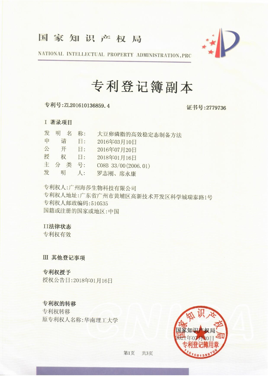 廣州海莎生物科技有限公司獲磷脂生產(chǎn)新專(zhuān)利,為開(kāi)發(fā)高質(zhì)量磷脂 產(chǎn)品提供了保障。